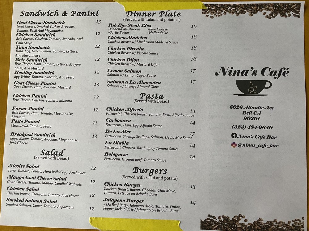 Nina’s Cafe Bar Menu (2025 Update)